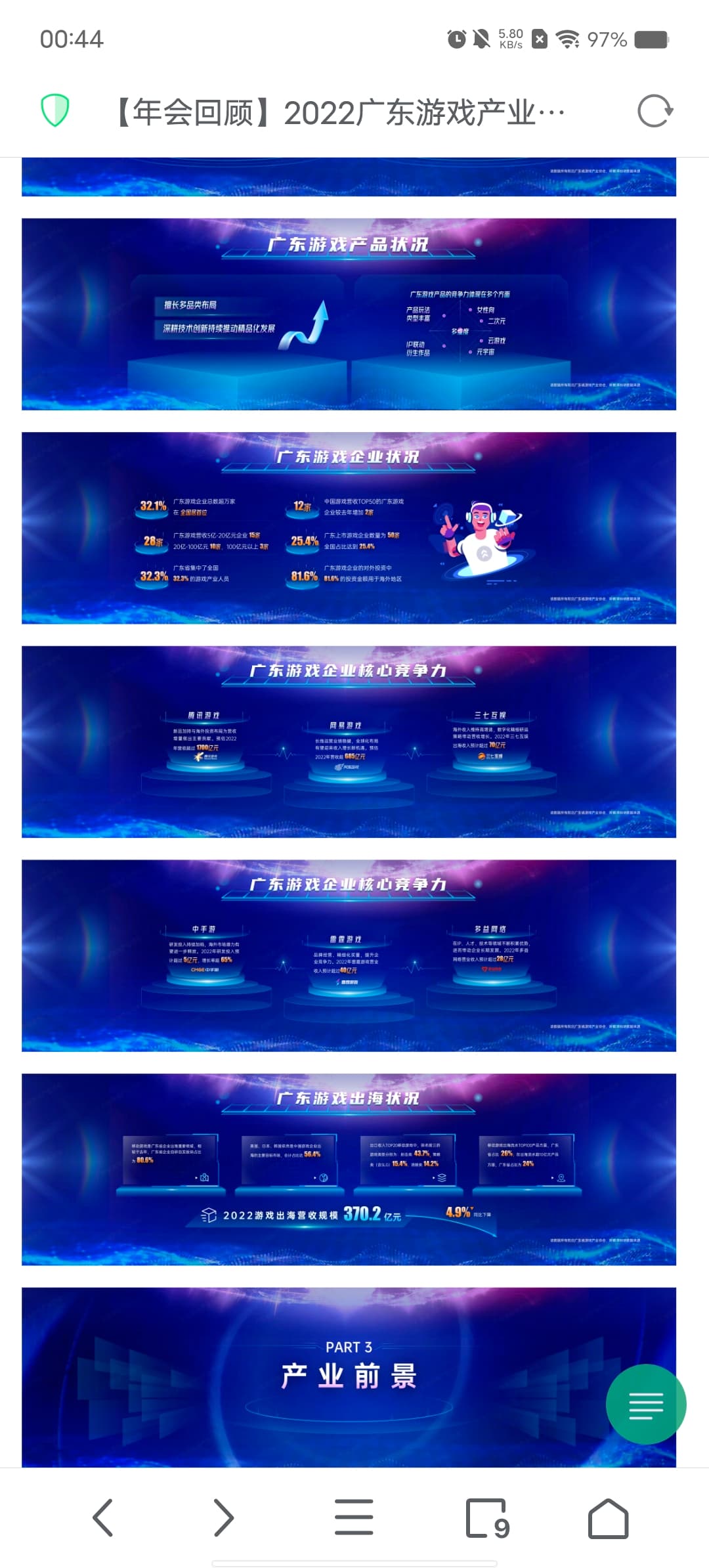 我之前说他们将海外营收也放到了总营收的依据是他们ppt的板块划分以及含义的理解,以22年的报告为例,PPT的板块划分是分别是市场规模、整体状况以及行业前景三个板块。