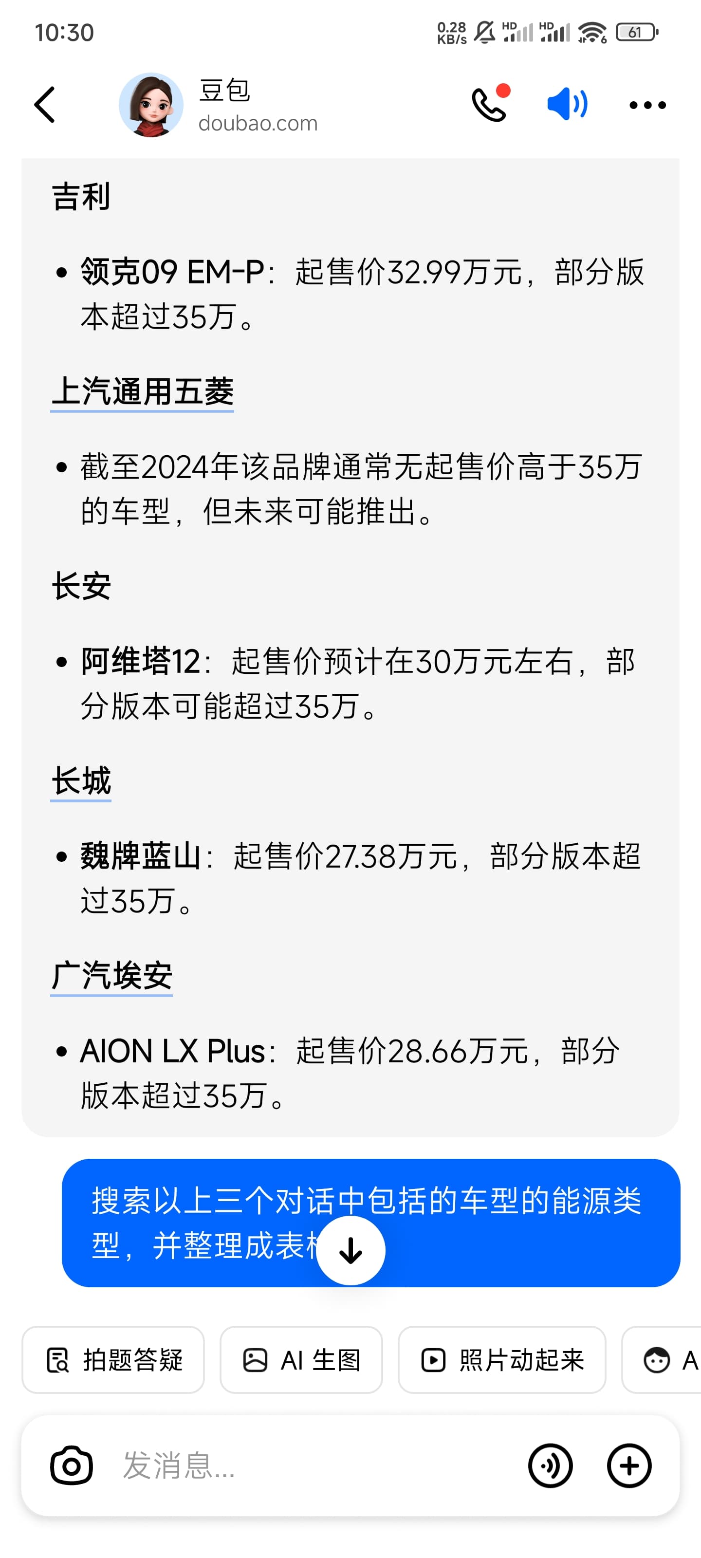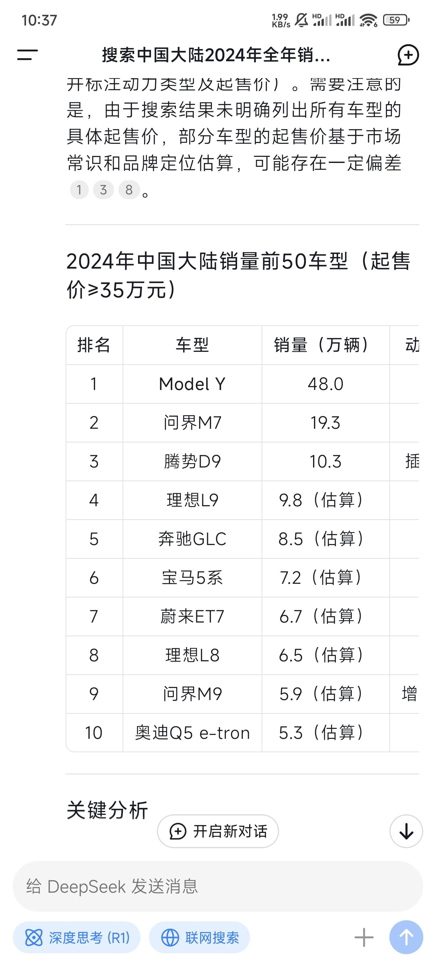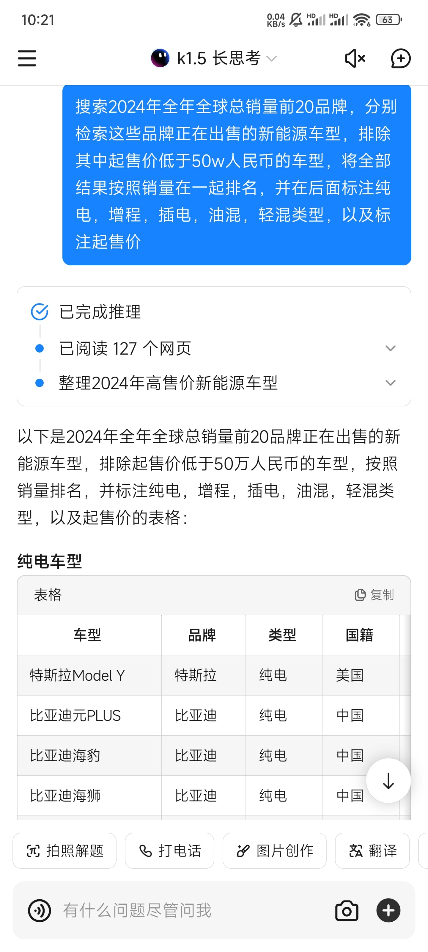 昨晚我以搜索中国新能源汽车2024年全年累计销量前20品牌,提取其中起售价大于xx元的部分,标注他的能源类型,起售价,品牌并制作成表格,这个问题去询问这些大模型