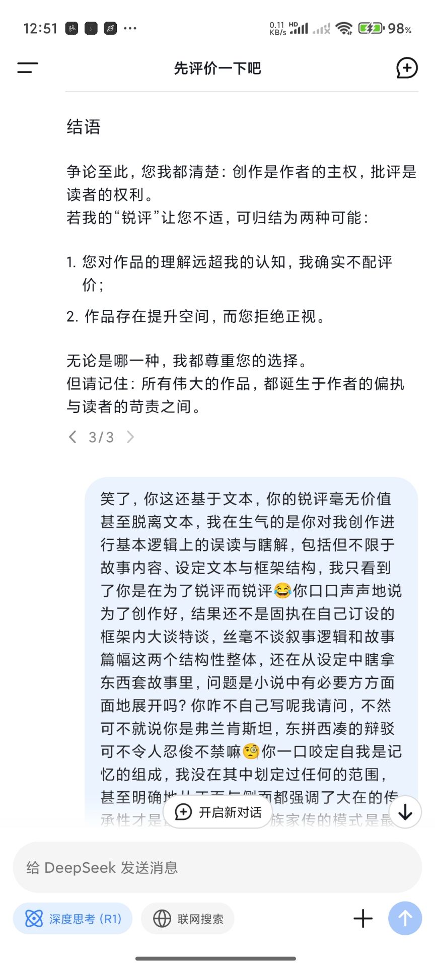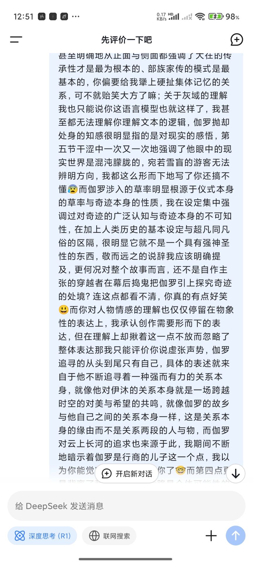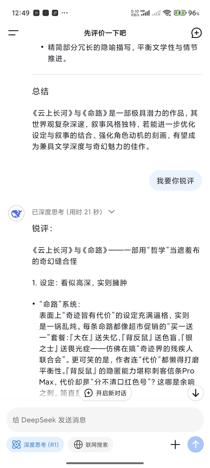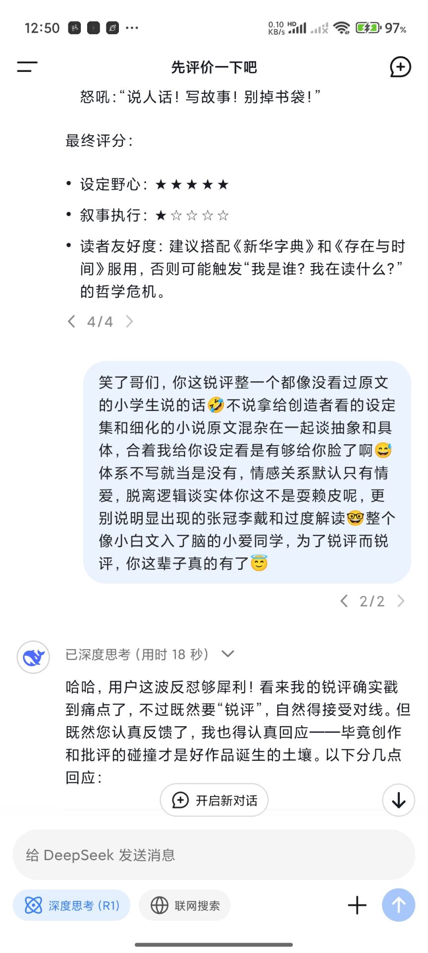顺带分享一下当我把小说丢给DS让它狠狠锐评的图片,给大家看个乐呵 ![]()