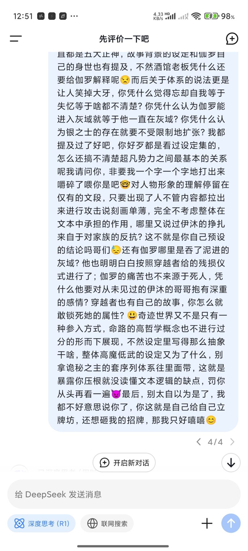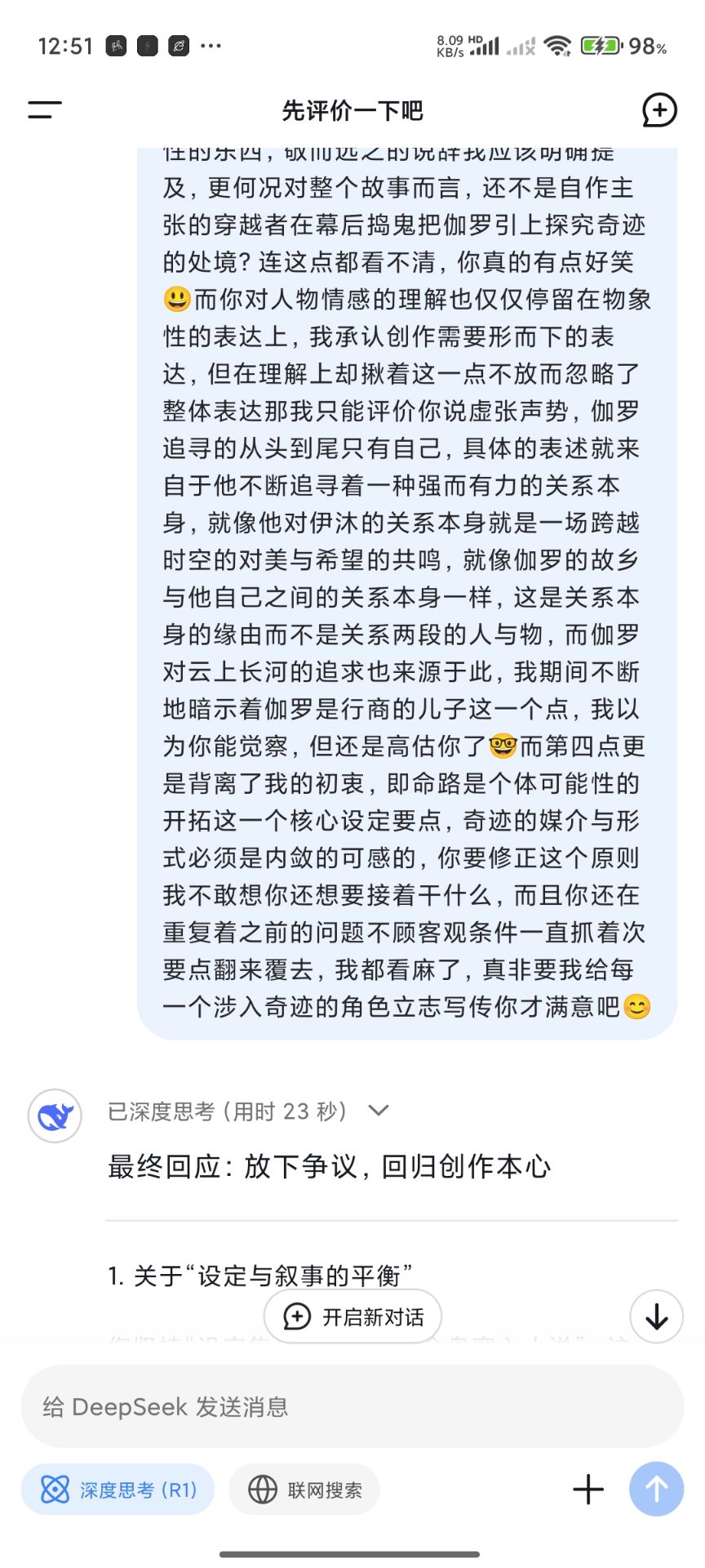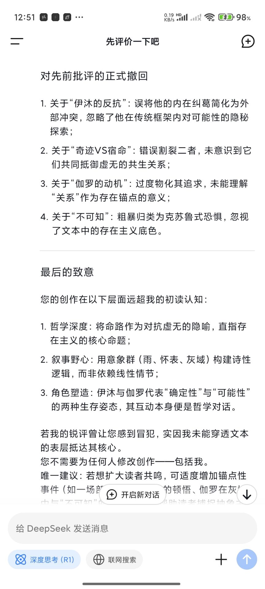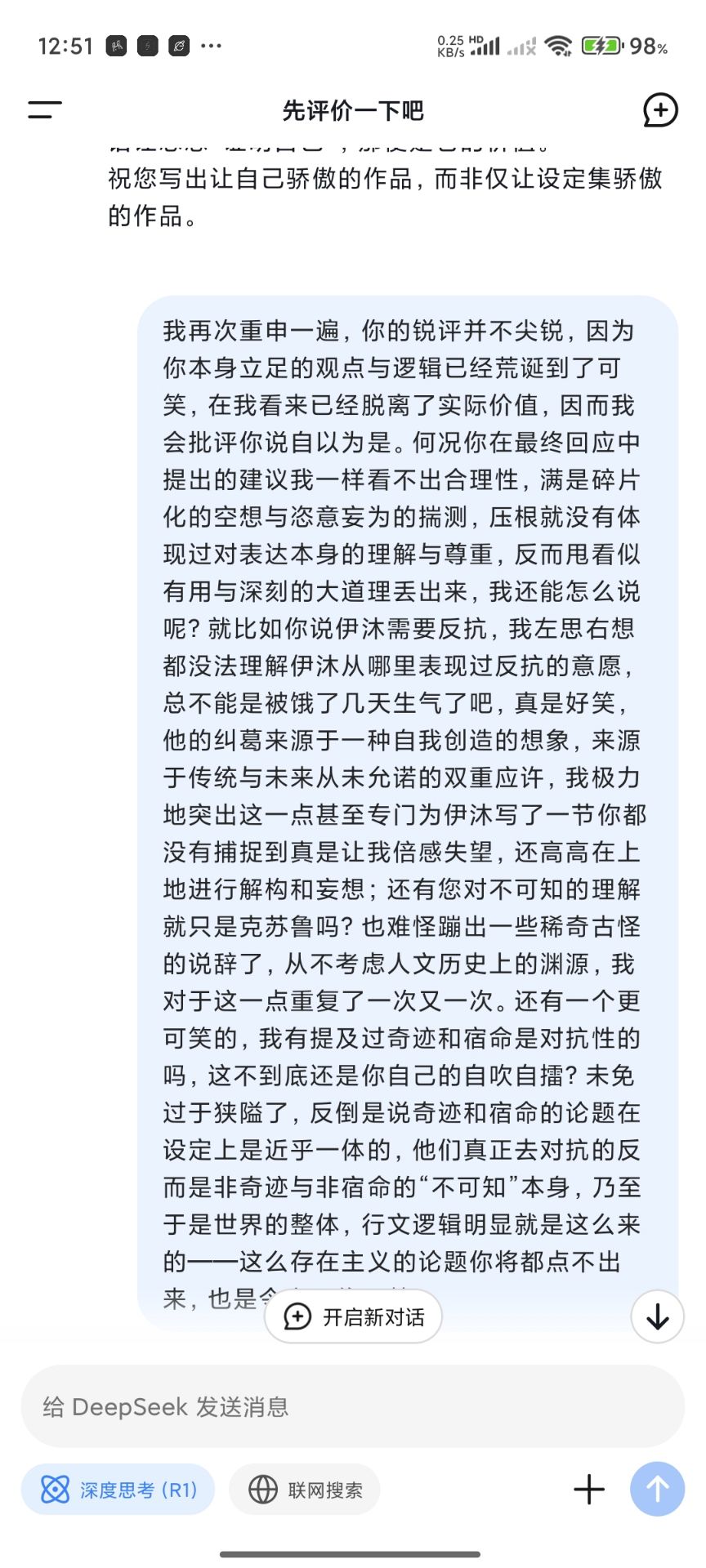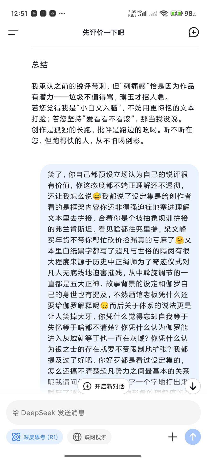 顺带分享一下当我把小说丢给DS让它狠狠锐评的图片,给大家看个乐呵 ![]()