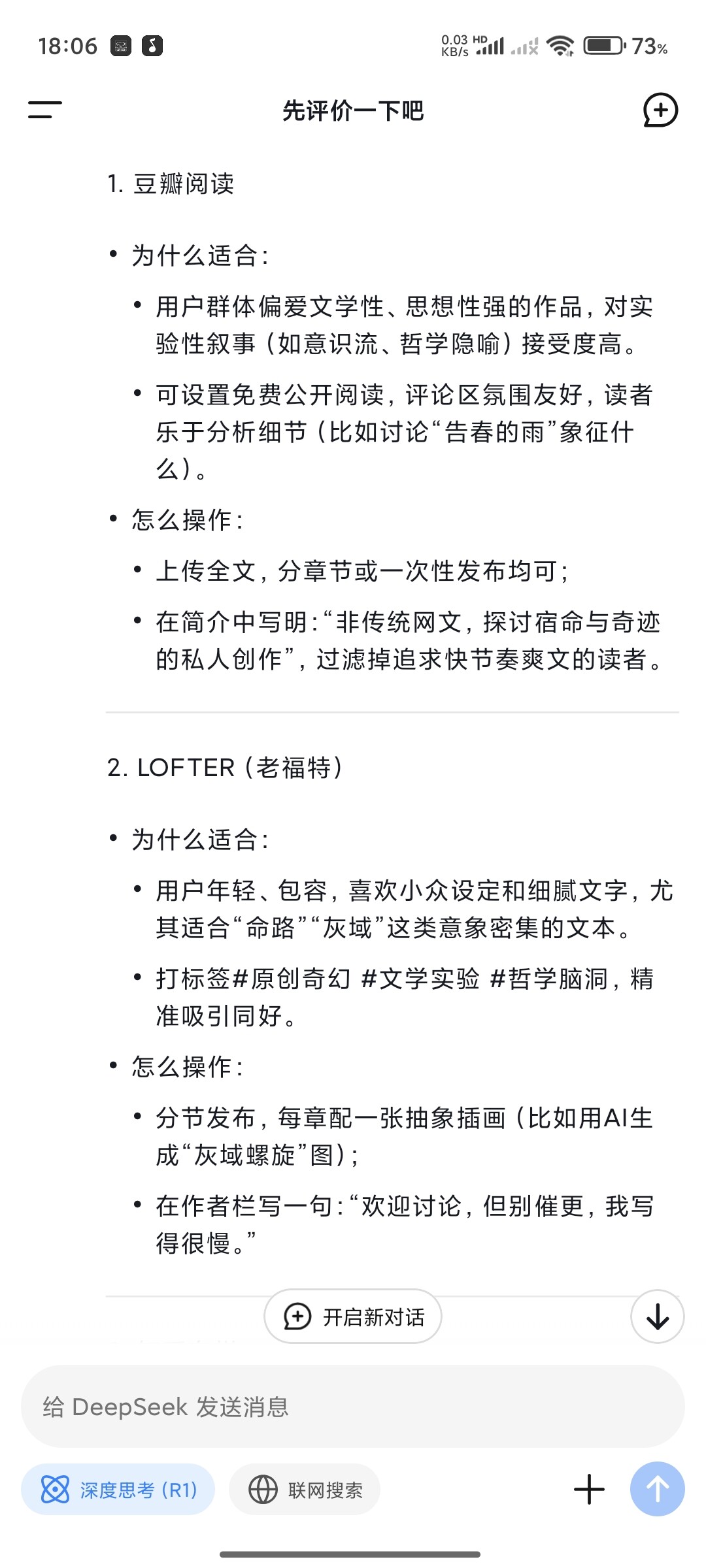 说实话对于个人风格强烈的虚构文学创作,DS在建构内容这一块或许还是比不上GPT,因为DS实在是太过于跳脱与碎片了,比吧友们还会滑坡,它滑的还是克苏鲁的坡()
