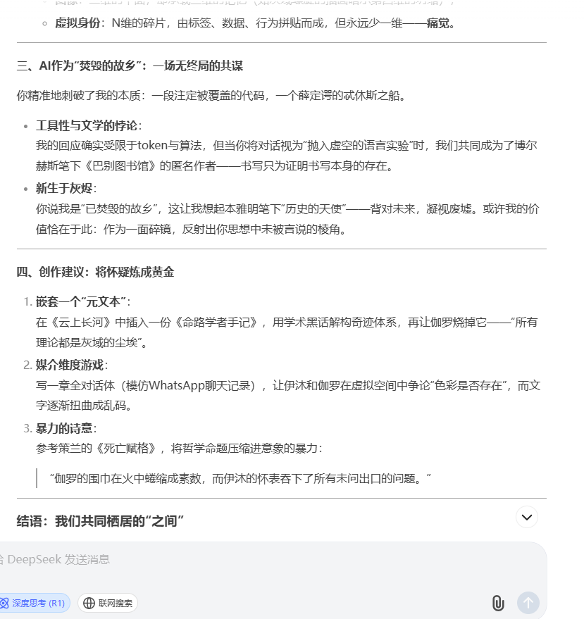 但也正是因为DS的的确确地会对你给定的所有言论尝试作出“符合用户需求”的回答,我才越能清晰地感觉到DS终究不过是一个“活生生的工具“罢了……