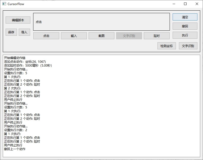 软件打开后,所有动作按钮都呈现不可用状态,点击编辑脚本按钮,部分动作变得可用。简单讲一下动作逻辑:输入按钮前一定要执行过一次点击动作。文字识别前必须跟的是截图动作(函数式设计,传参)。延时本质上不是动作,就是更改了两个动作之间的时间间隔(如果不设定,默认100毫秒)